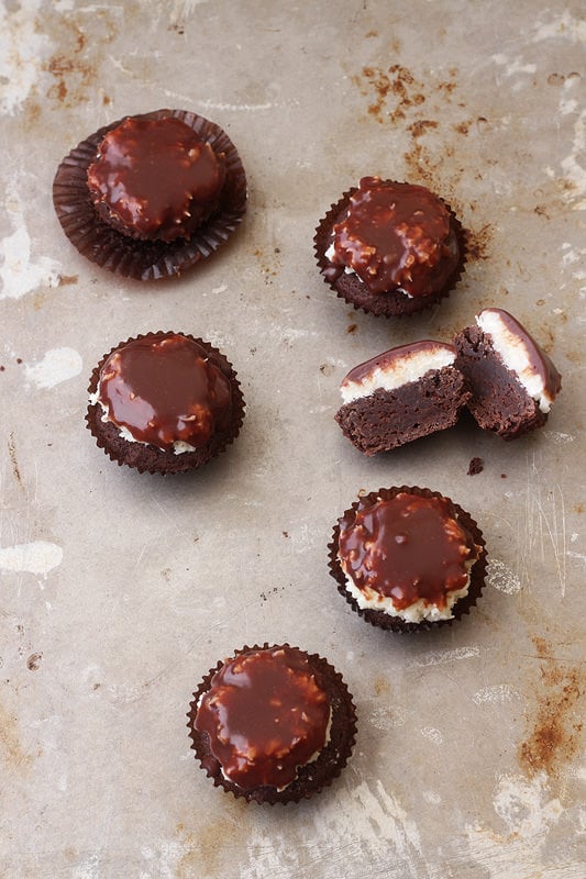 1. For the brownies:Preheat the oven to 325°F. Line a mini muffin tin with paper liners.